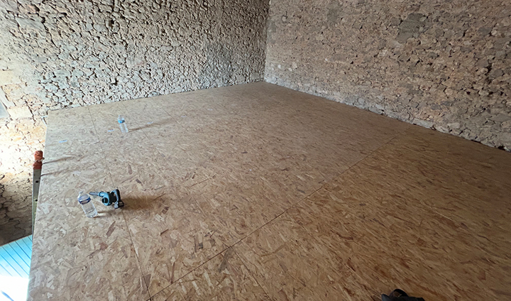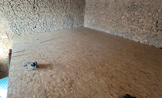 Le chantier consistait à retirer une ancienne mezzanine vieillissante pour installer une nouvelle structure plus solide et sécurisée avec chevrons et plancher OSB.