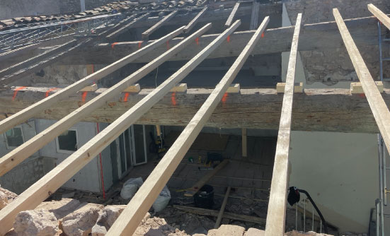 Le chantier concernait la rénovation complète d’une extension extérieure avec toiture en tuiles, ainsi que la remise en état des éléments porteurs (poutres, chevrons ...) et de la façade attenante.